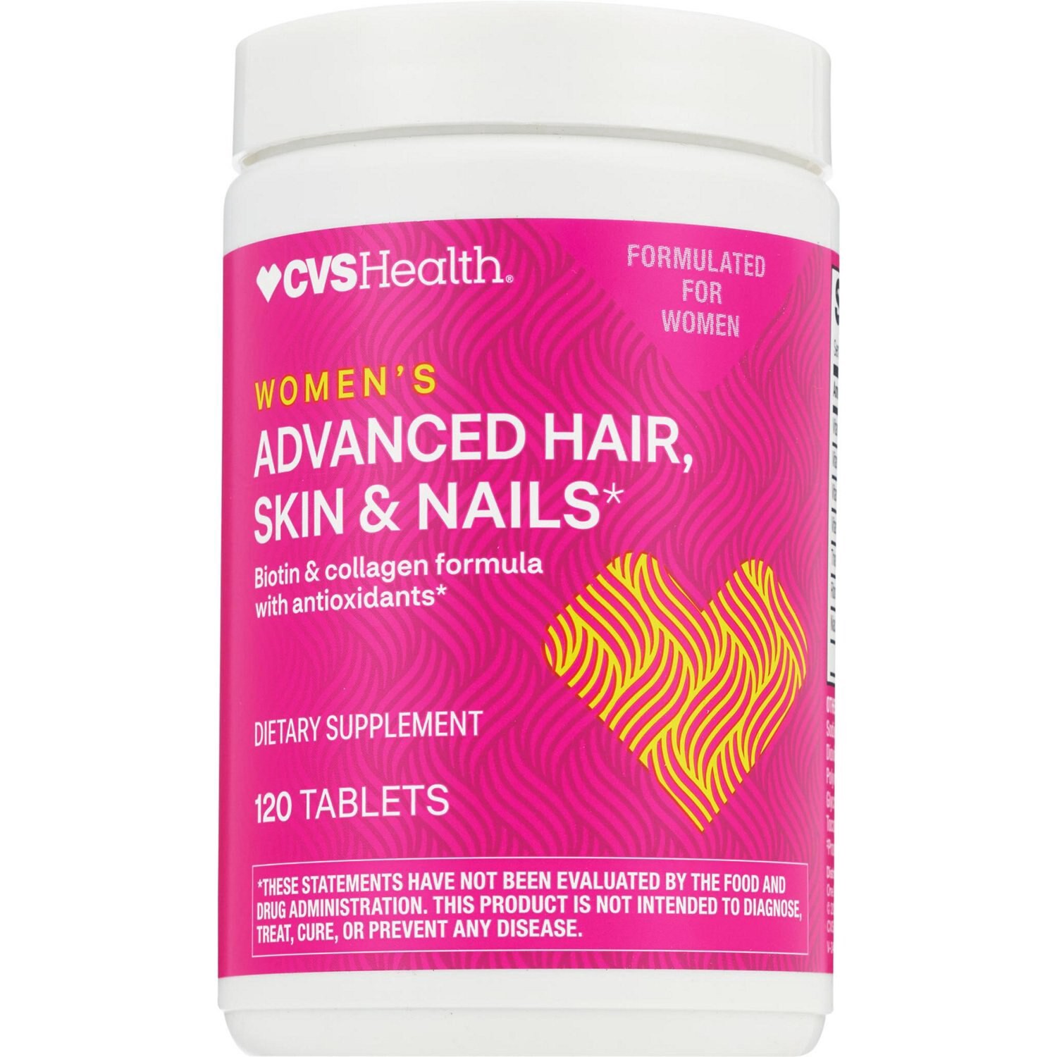 CVS Health Women's Advanced Hair, Skin & Nails is a biotin & collagen formula with antioxidants. It provides nutritional support for hair, skin & nails* -- *THIS STATEMENT HAS NOT BEEN EVALUATED BY TH…