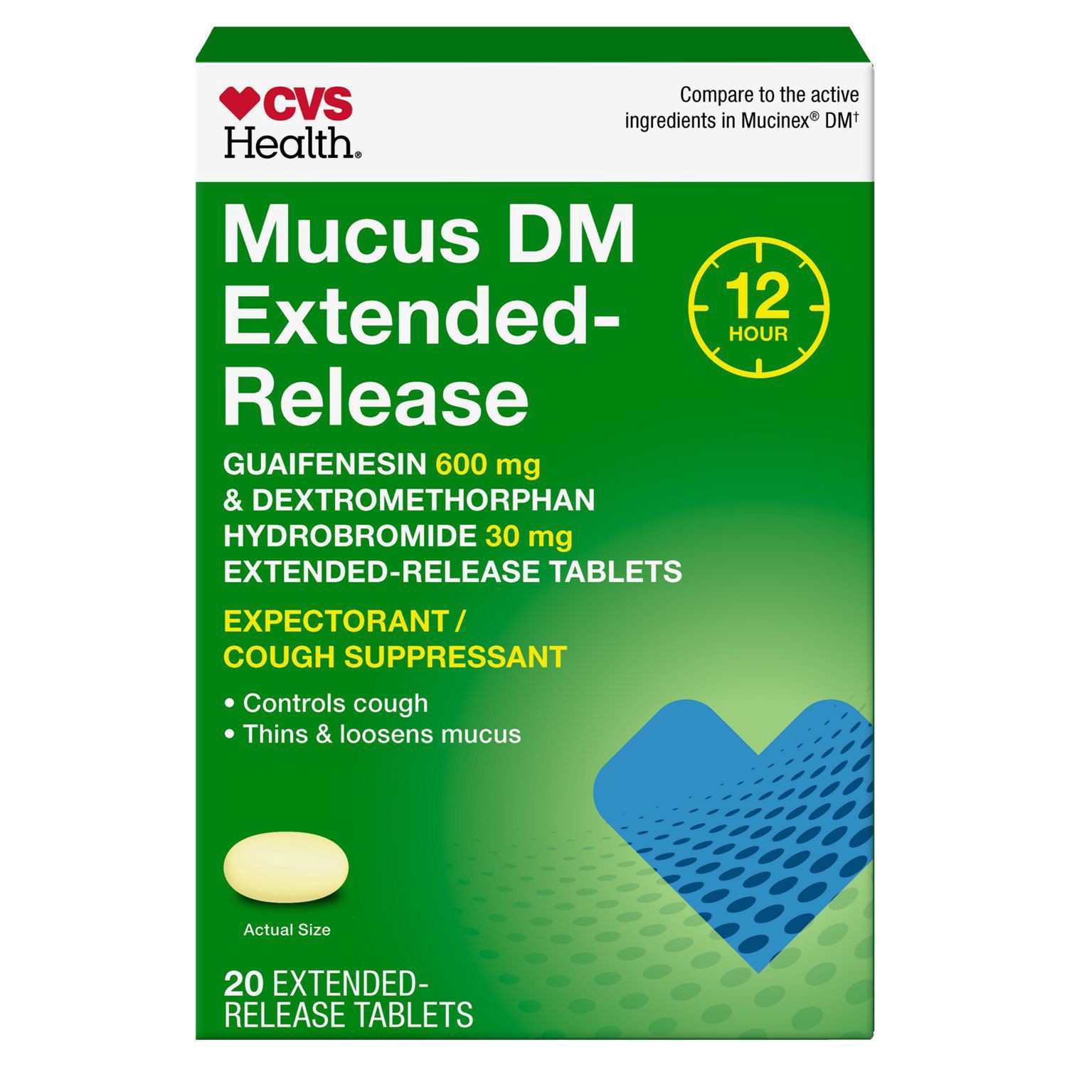Compare to the active ingredients in Mucinex DM. CVS Health Mucus DM Guaifenesin and Dextromethorphan Hydrobromide Extended-Release Tablets, 600 mg/30 mg is a cough suppressant and expectorant that he…