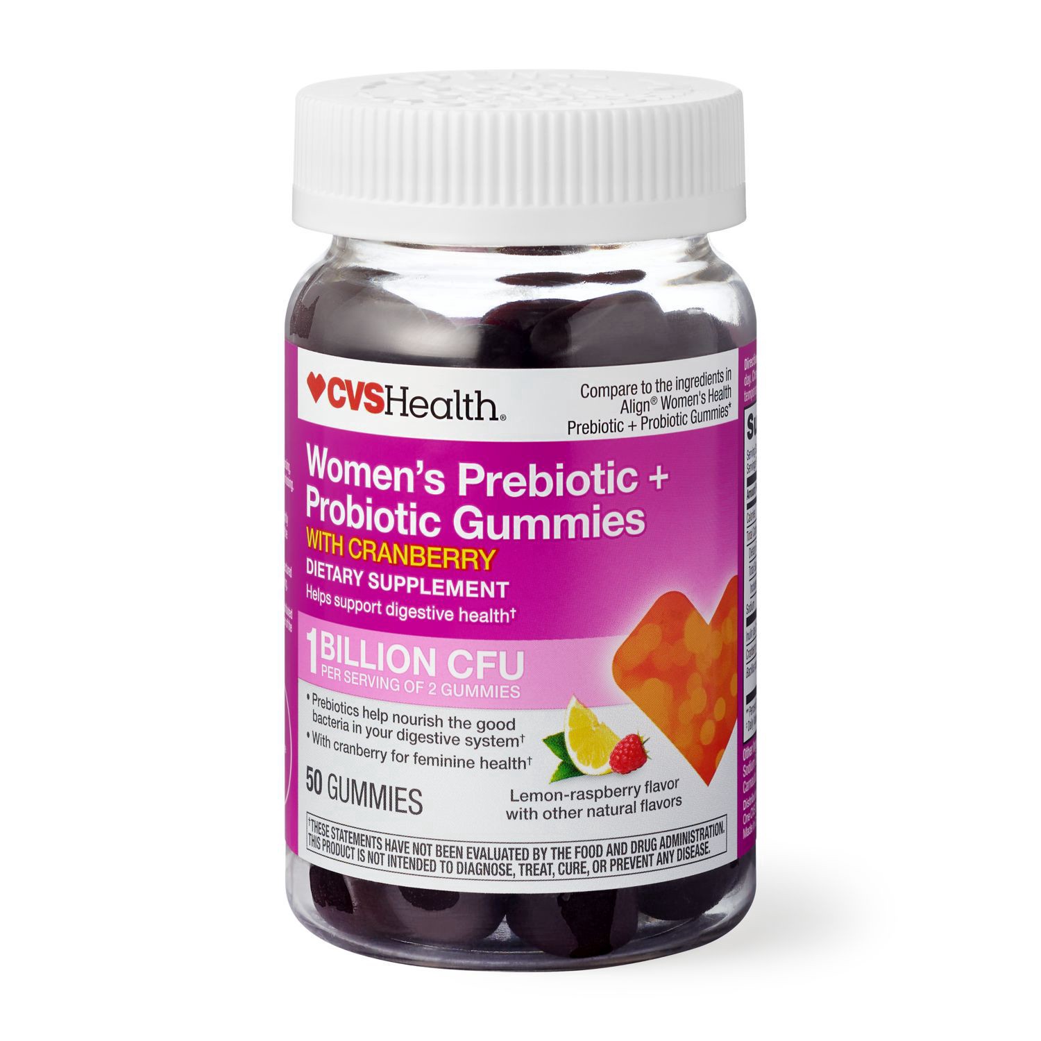 Women's probiotic and prebiotic gummies. Features a delicious lemon raspberry flavor. Helps support digestive health. 50-count bottle. Compare to the ingredients in Align. CVS Health quality. Give you…