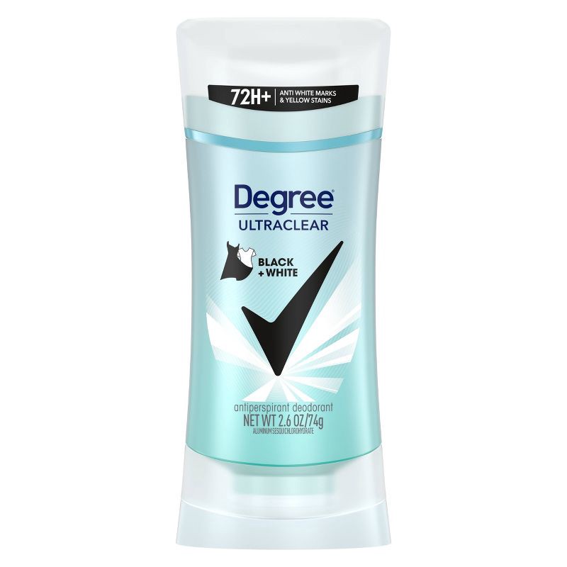 - WHITE SHIRT, BLACK SHIRT, NO PROBLEM: Degree UltraClear Black+White Antiperspirant Deodorant delivers 72-hour sweat and odor protection with anti-white mark and yellow stain technology.