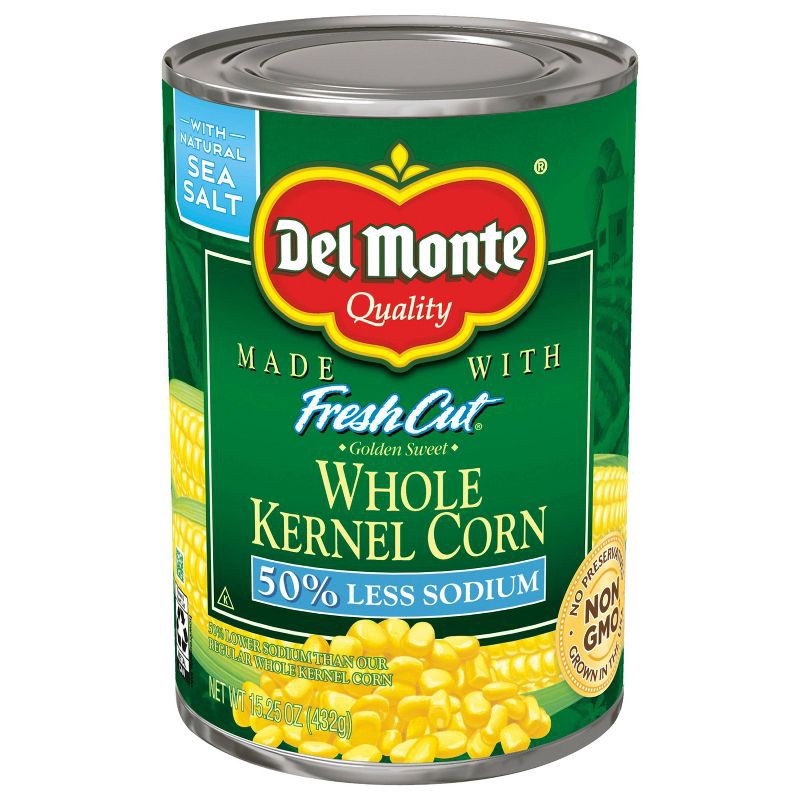 DEL MONTE FRESH CUT 50% Reduced Sodium Whole Kernel Corn is picked at the peak of freshness for the highest standard in rich flavor. This Non-GMO* canned corn with 50% less sodium** contains no artifi…