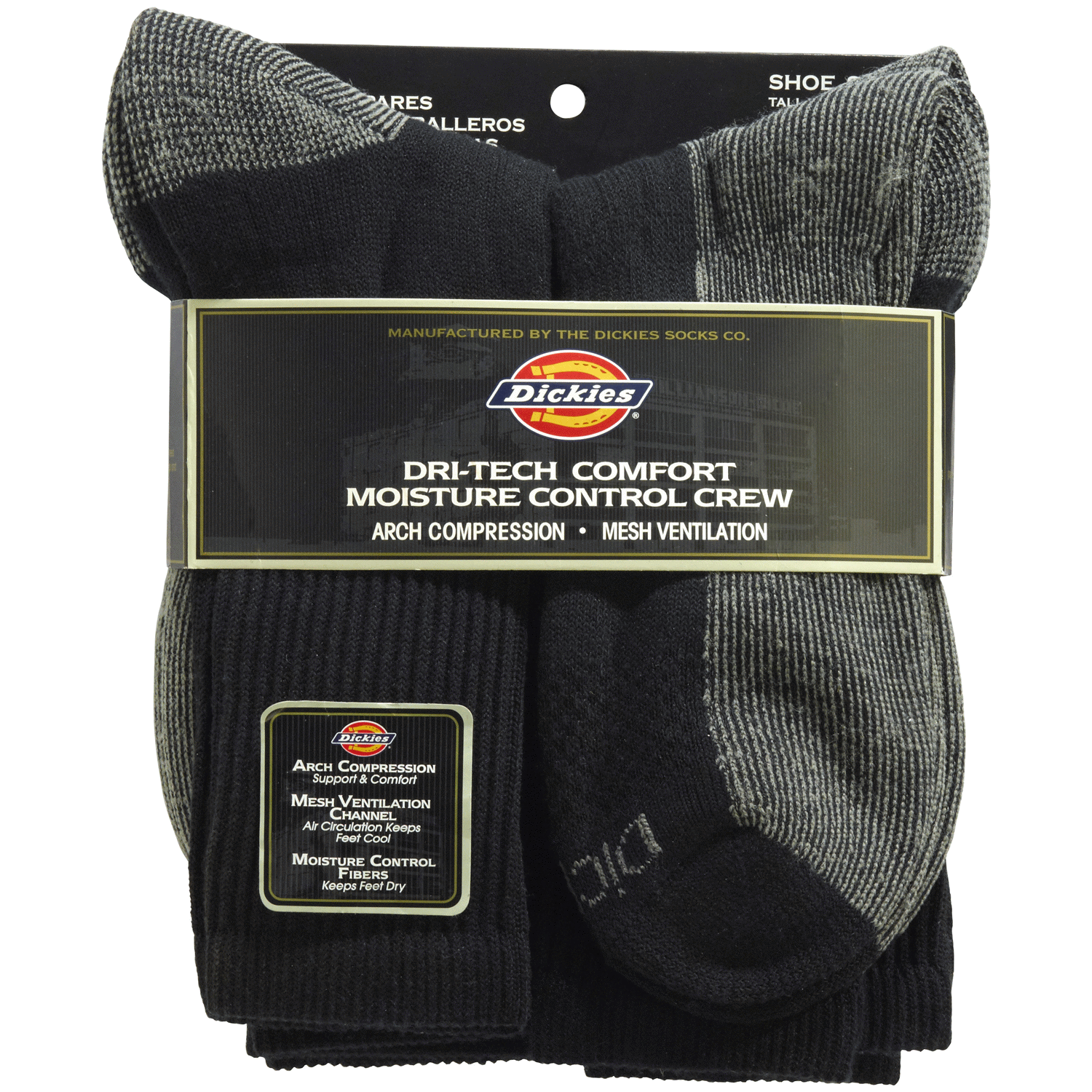 Dickies Dri-Tech Comfort Moisture Control Black Crew Socks, Size 6-12