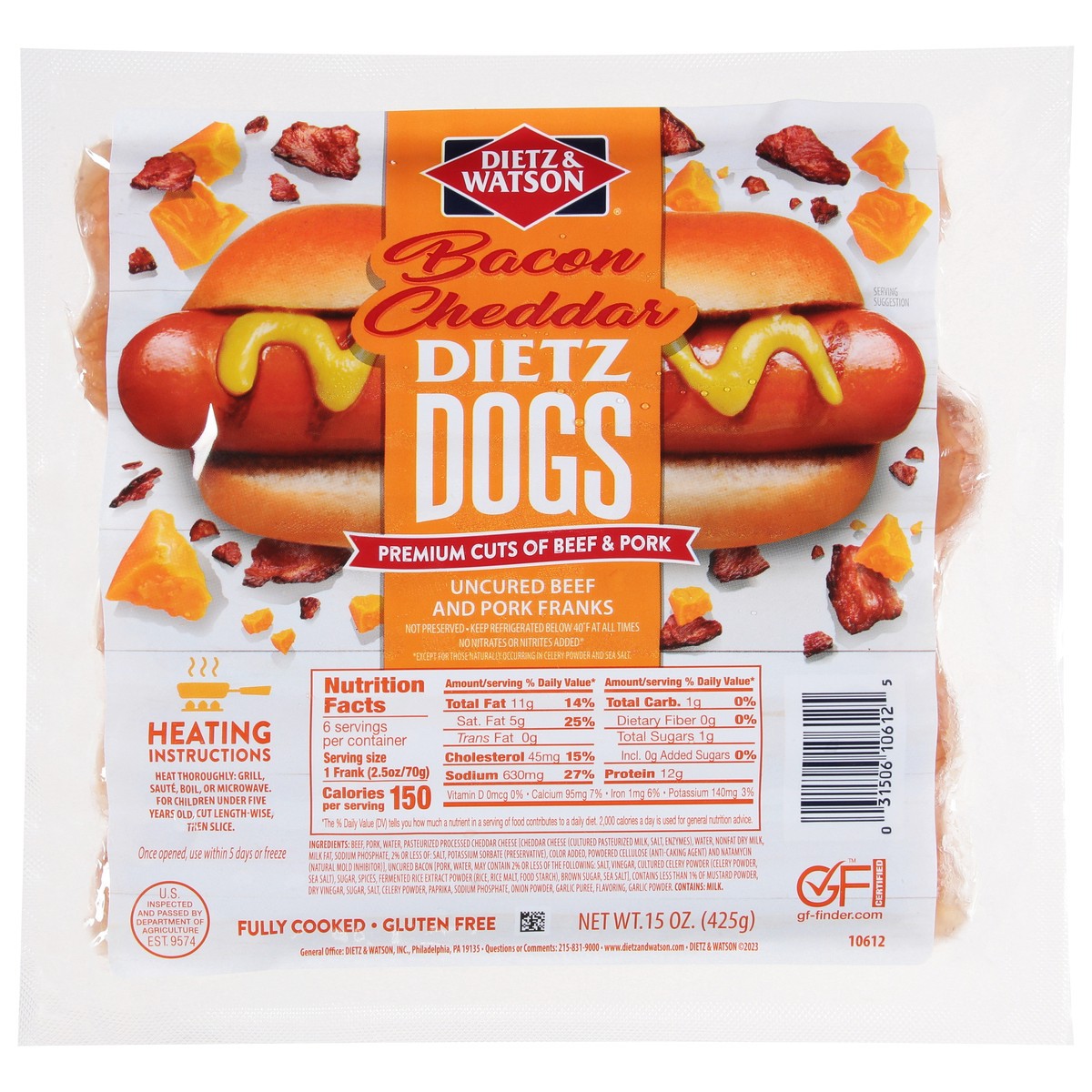These dogs are the real deal. Theyre handcrafted, and made using only Dietz & Watson premium meat. No artificial flavors, fillers, colors or mystery-anything. We dare you to find a tastier hot dog.