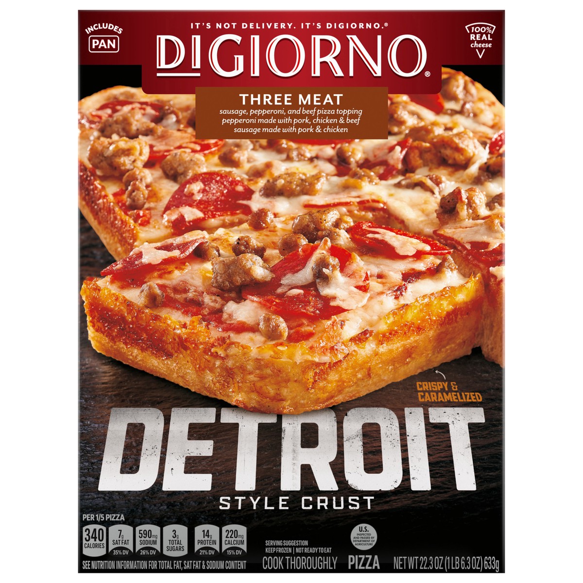 DiGiorno Three Meat Frozen Pizza on a Detroit Style Crust is crispy and caramelized around the edges for a signature taste. DiGiorno three meat pizza is topped with sausage, pepperoni and beef pizza t…