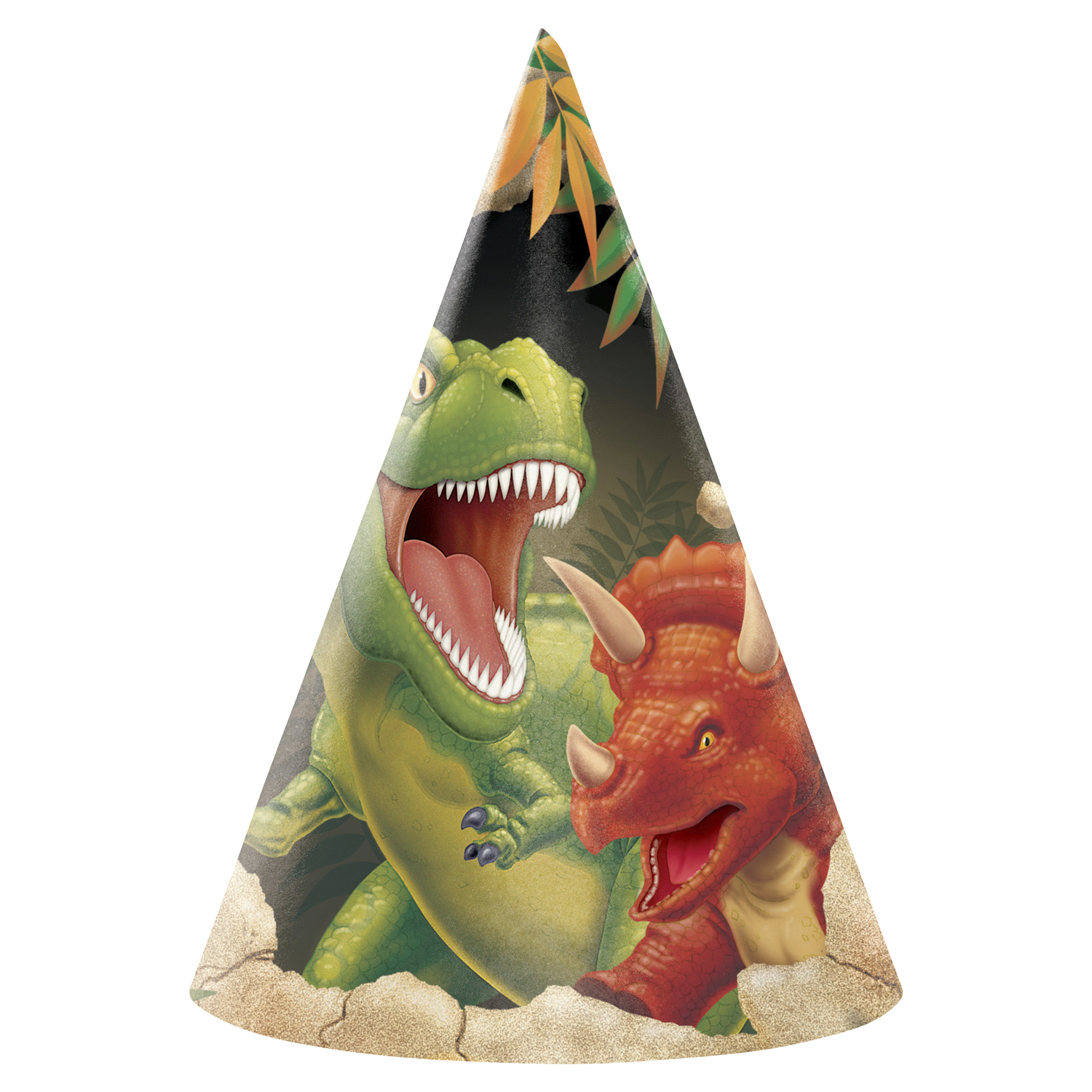 Top off your special little dino's party with the Dinosaur Party Hat. These cone hats come with an elastic band for a comfortable fit and feature the theme's T-Rex and Triceratops in action. Sold in p…