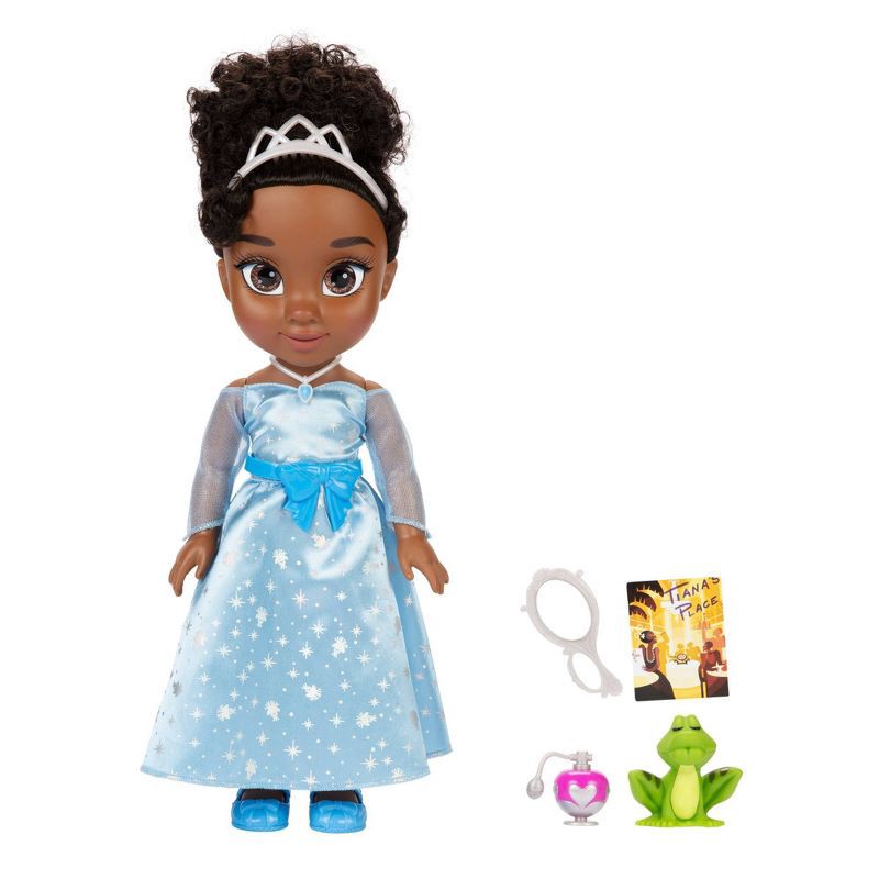 - INCLUDES: 1 Tiana Doll, 1 Doll Outfit, 1 Doll Tiara, 1 Doll Necklace, 1 Doll Mirror, 1 Doll Perfume Atomizer, 1 Doll Menu and 1 Prince Naveen Frog Figure