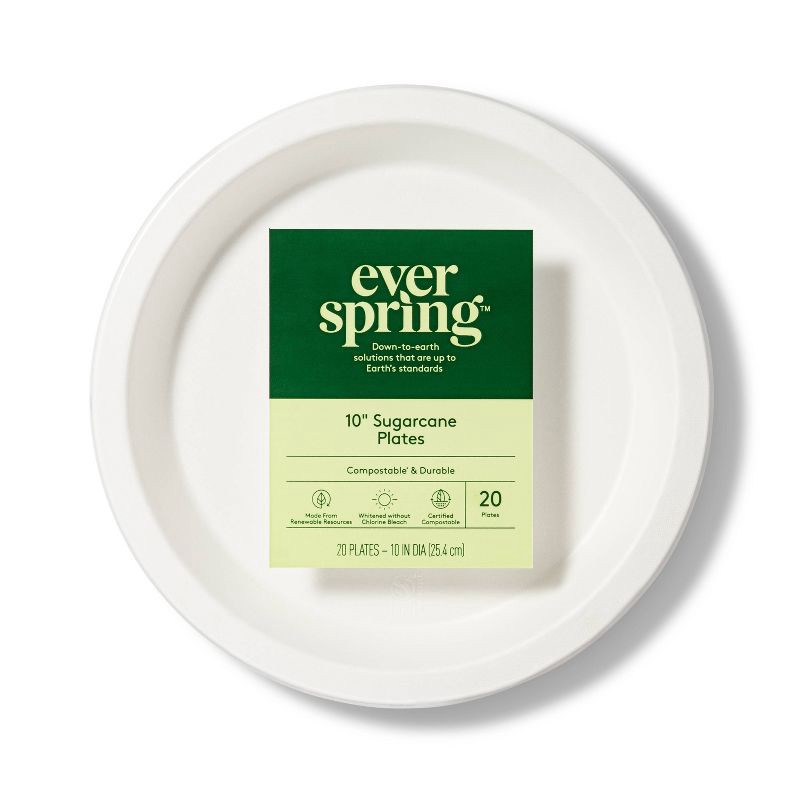 Bring convenience to get-togethers like family cookouts, picnics and more with this 20-Count Set of Disposable Sugarcane Plates from Everspring™. Made from sugarcane pulp — a renewable resource that b…
