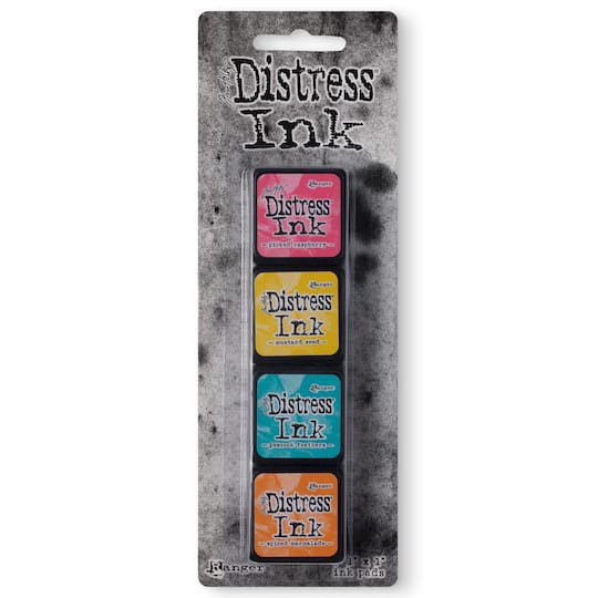 RANGER-Distress Mini Ink Kits. Features the same unique, water- based dye ink formula used in the full-size pads, but in a convenient stackable pad. The raised felt makes it easy to use on smaller cra…