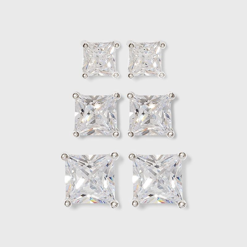 Accessorize your dress with these Women's Sterling Silver Stud or Square Cubic Zirconia Earring Set 3pc in Silver. This pair of fine jewelry earrings, showcasing a square-cut clear cubic zirconia ston…