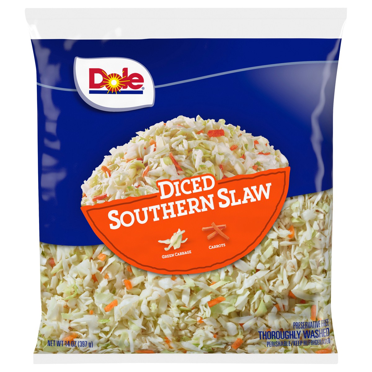 Green Cabbage. Carrots. Thoroughly washed. Preservative free. Diced Southern Slaw is sweet and crunchy, with finely diced fresh cabbage and carrots. Use it with your own slaw dressing to make a true s…