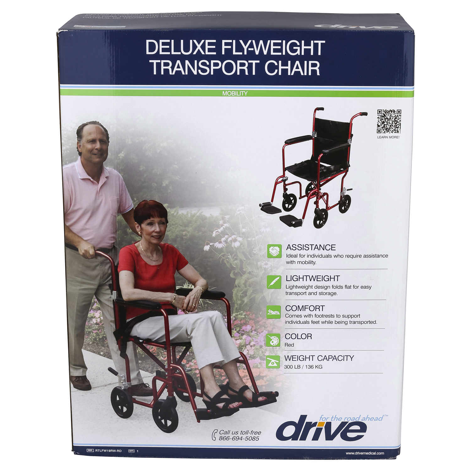 The Deluxe 19" Fly Weight Aluminum Transport Chair with Removable Casters in red by Drive Medical weighs about 30% less than traditional transport chairs. Weighing only 19 pounds, this chair has a has…