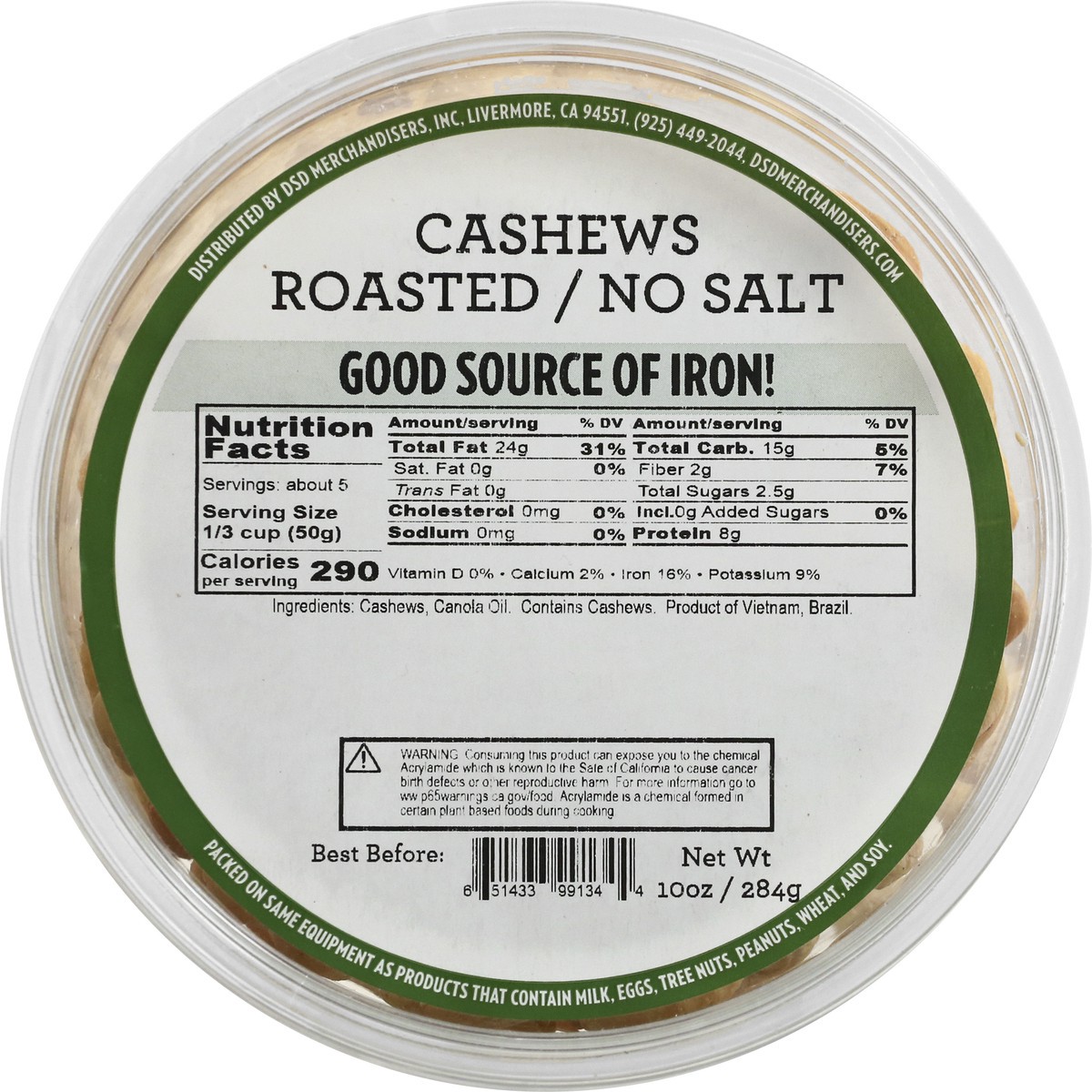 DSD Merchandisers No Salt Roasted Cashews Prepackaged - 10 Oz.