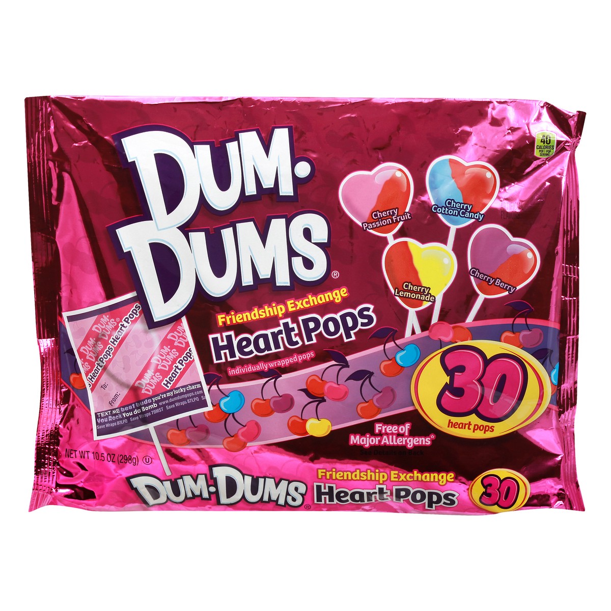 40 Calories per 1 pop serving. Cherry Passion Fruit. Cherry Cotton Candy. Cherry Lemonade. Cherry Berry. Individually wrapped pops. Write-Able To/From wrappers! Spangler - Since 1906. Free of Major Al…