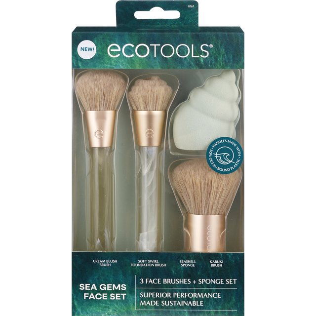 A four-piece, sea-shell inspired, full face brush set. Brush handles made with 50% ocean bound plastic and packaging made with recycled materials. This kit has all th…