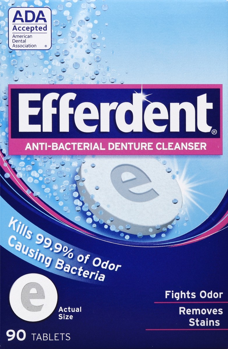 Kills 99.9% of odor causing bacteria. ADA accepted. American Dental Association. Fights odor. Removes stains. Clean with Efferdent Anti-Bacterial Denture Cleanser daily to: kill 99.9% of the germs tha…