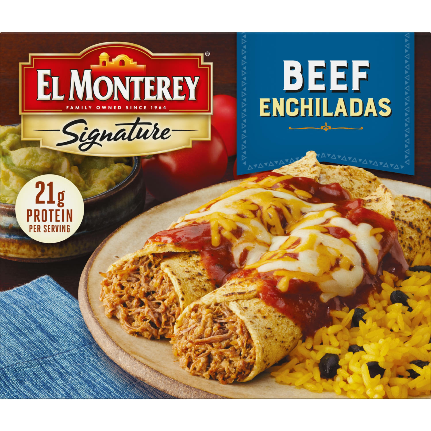 For convenient, delicious single-serve beef freezer meals, try El Monterey Signature Beef Enchiladas Meals. Two beef enchiladas are topped with zesty chipotle sauce, Monterey Jack cheese and cheddar c…