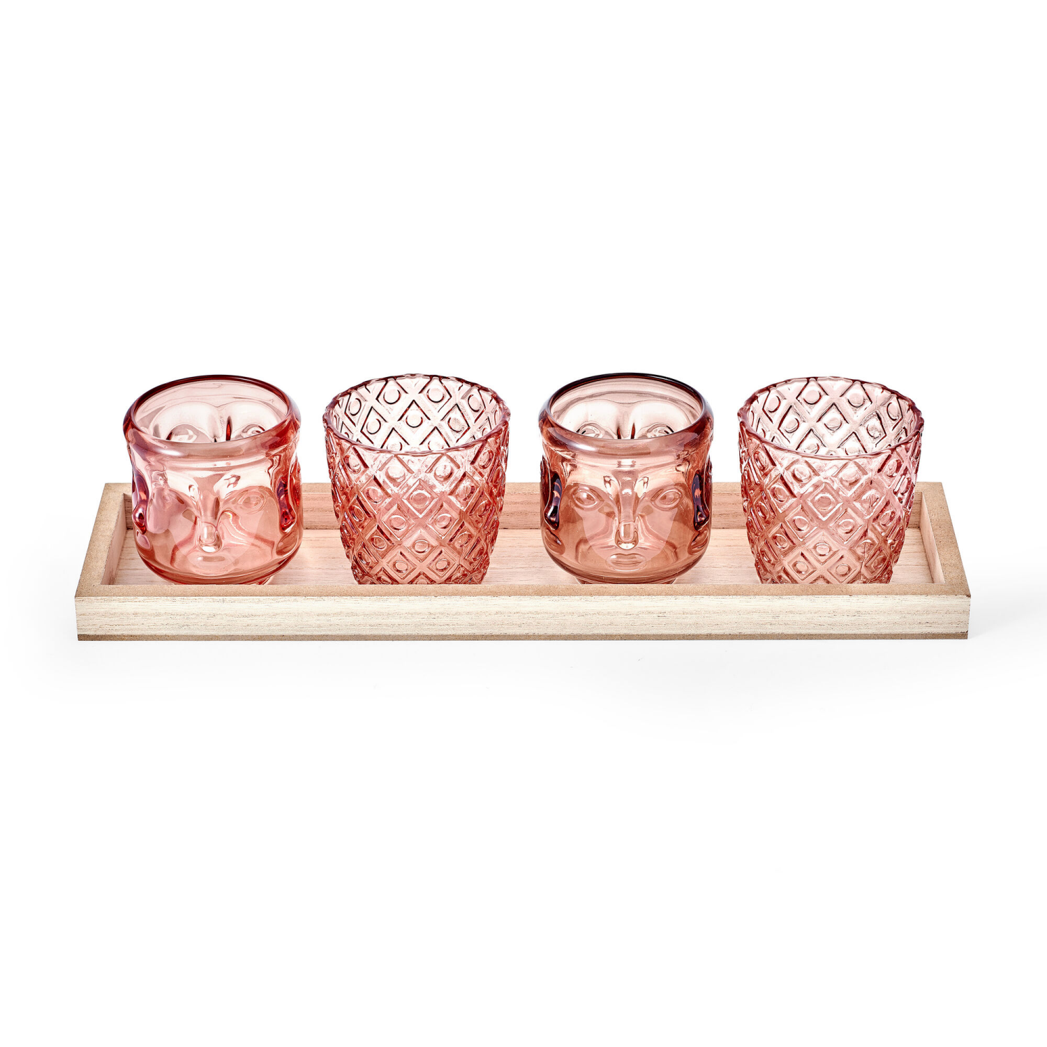 Enhance your décor while adding a soft glow to any room with this Set of 4 Rose Colored Tea light Holders on a Tray by Elements. These rose-colored glass holders placed on a modern wooden tray bring a…