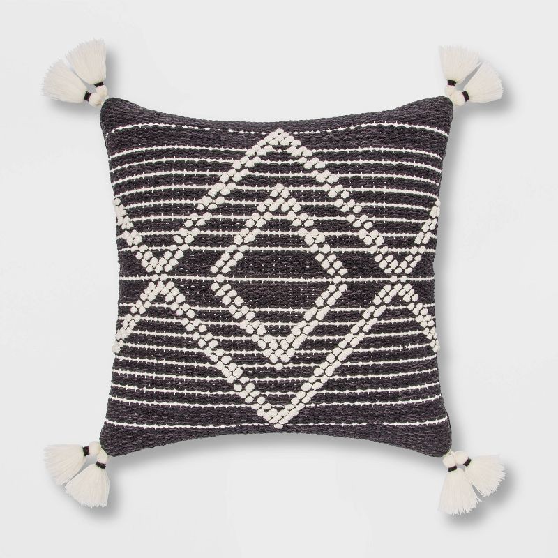 Decorate your home with the beautiful boho charm of the Embroidered Textured Diamond Throw Pillow from Opalhouse™. A center diamond medallion made of white knots over a textured striped pattern is the…