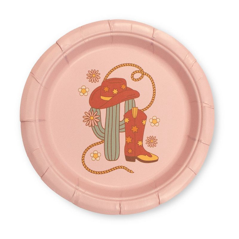 Add some country charm to your celebration with these Western Plates. Featuring a pink background and playful western icons like boots, hats, and cacti, these plates bring a cute, feminine twist to cl…
