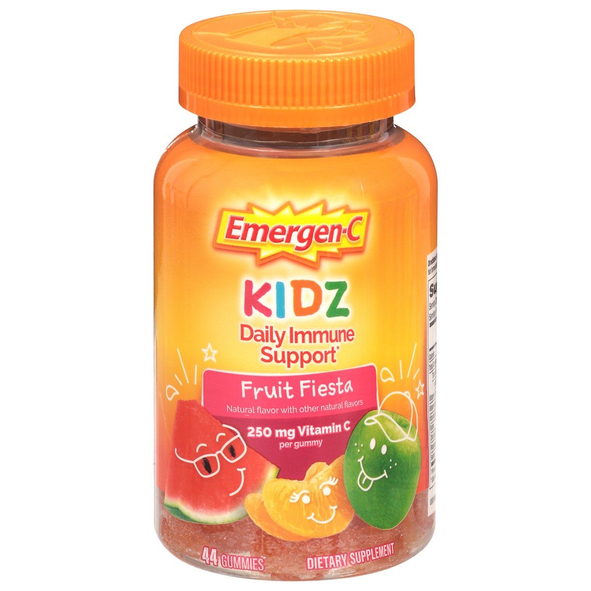 44 count bottle of Fruit Fiesta flavored Emergen-C Kidz Daily Immune Support (1) Dietary Supplements, Flavored Gummies with Vitamin C and B Vitamins. Dietary supplements with 250 mg of high potency vi…