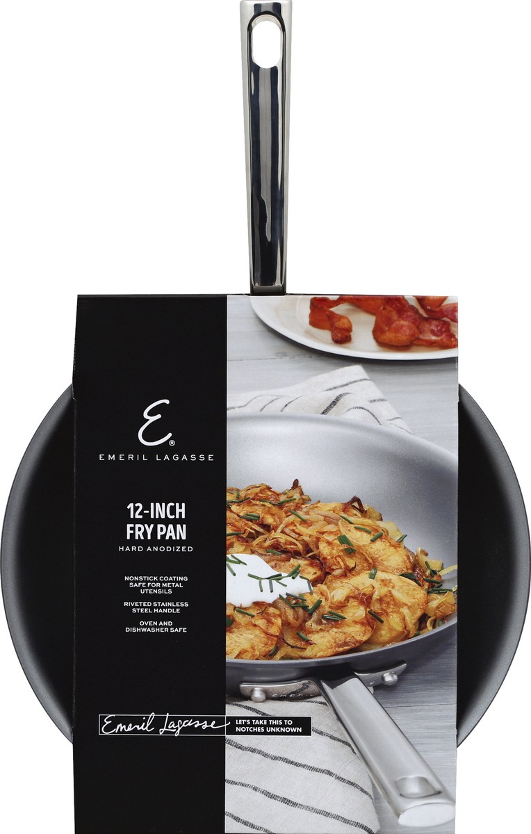 12 inch. Nonstick coating safe for metal utensils. Riveted stainless steel handle. Oven and dishwasher safe. Emeril Lagasse. Let's take this to notches unknown. Riveted stainless steel handle goes fro…