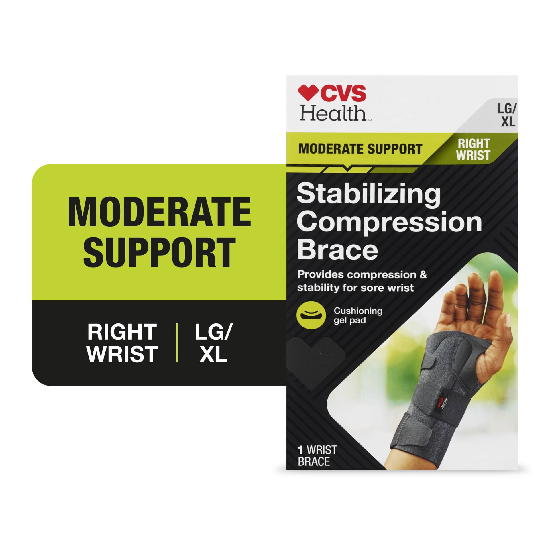 HSA/FSA Eligible. -- Product packaging may vary.. -- LG/XL RIGHT WRIST Provides compression & stability for sore wrist Cushioning gel pad CVS Health Stabilizing Compression Brace provides moderate sup…