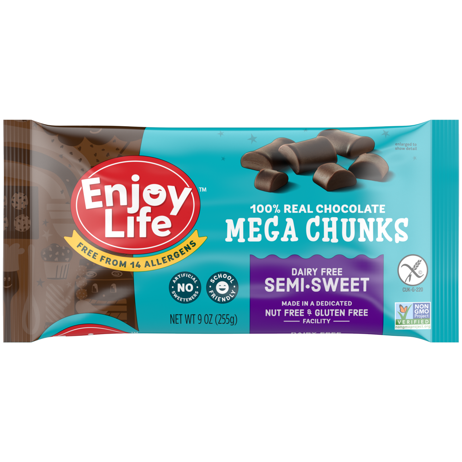 Enjoy Life Semi Sweet Chocolate Mega Chunks. Dreaming of dairy-, soy- and gluten-free cookies, blondies and cake pops? You can have it all by using our delicious Semi-Sweet Mega Chunks.