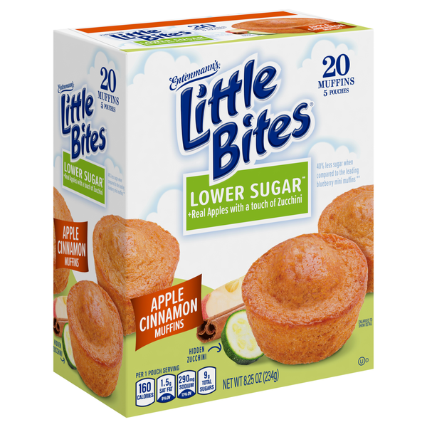 Get your morning off to the right start with Entenmann's Little Bites Lower Sugar Apple Cinnamon Mini Muffins. These mini muffins have 9g of sugar, and are made with real apples and hidden zucchini. T…
