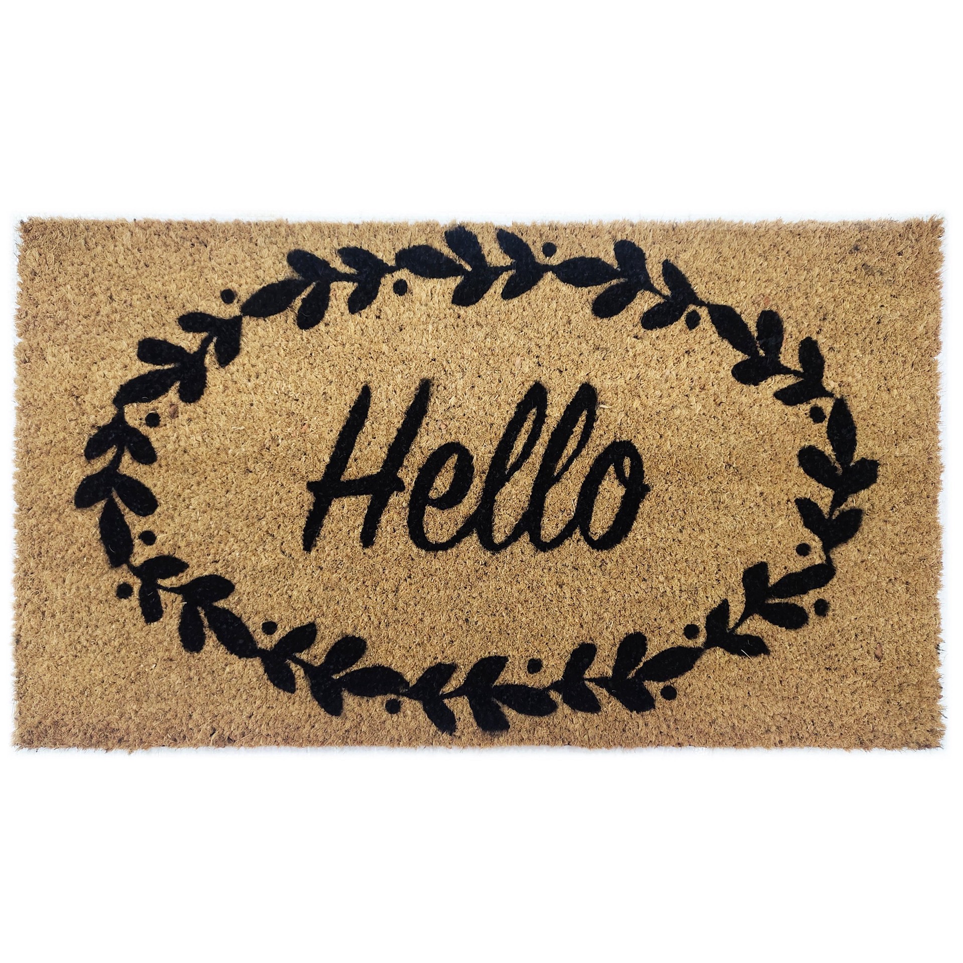 Extend a stylish welcome to all who enter your home yearround with this Hello Natural Coir Door Mat. The design features a debossed Hello greeting in elegant black script, surrounded in black floral w…