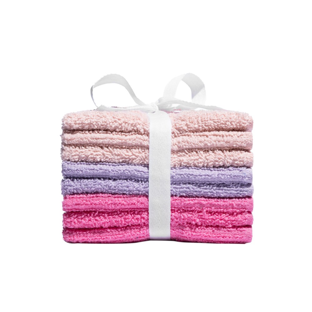 100% Cotton. Assorted 8 pack washcloth pack. Each pack has 4 solid terry wash cloths and 4 textured wash cloths. 3 different bright colors make clean up fun! Soft and absorbent. Twill ribbon tie makes…