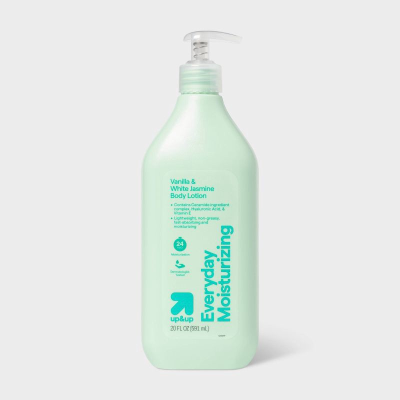 This 20-Ounce Vanilla & White Jasmine Everyday Moisturizing Body Lotion from up&up™ will keep your skin happily hydrated. Made with a ceramide ingredient complex, hyaluronic acid and vitamin E, this m…