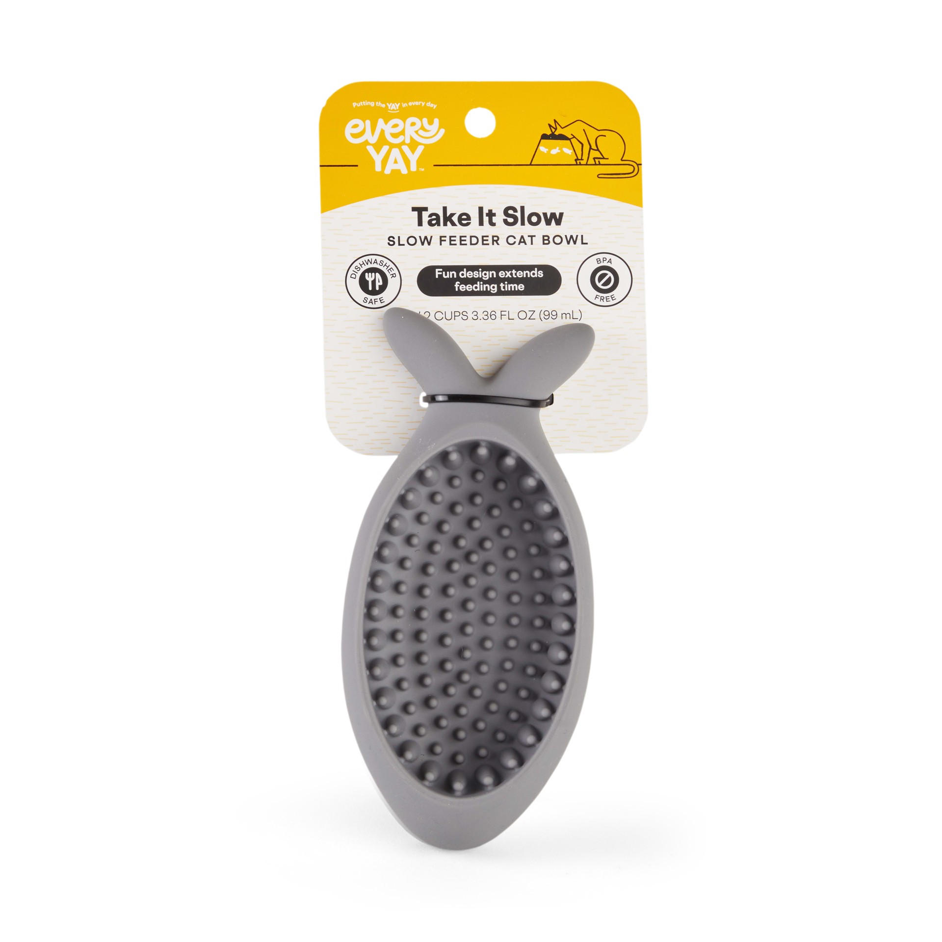 Extend feeding time with the Gray Fish Slowfeeder from EveryYay. Your pet will love the cute cat design and youll love that its dishwasher and microwave safe.