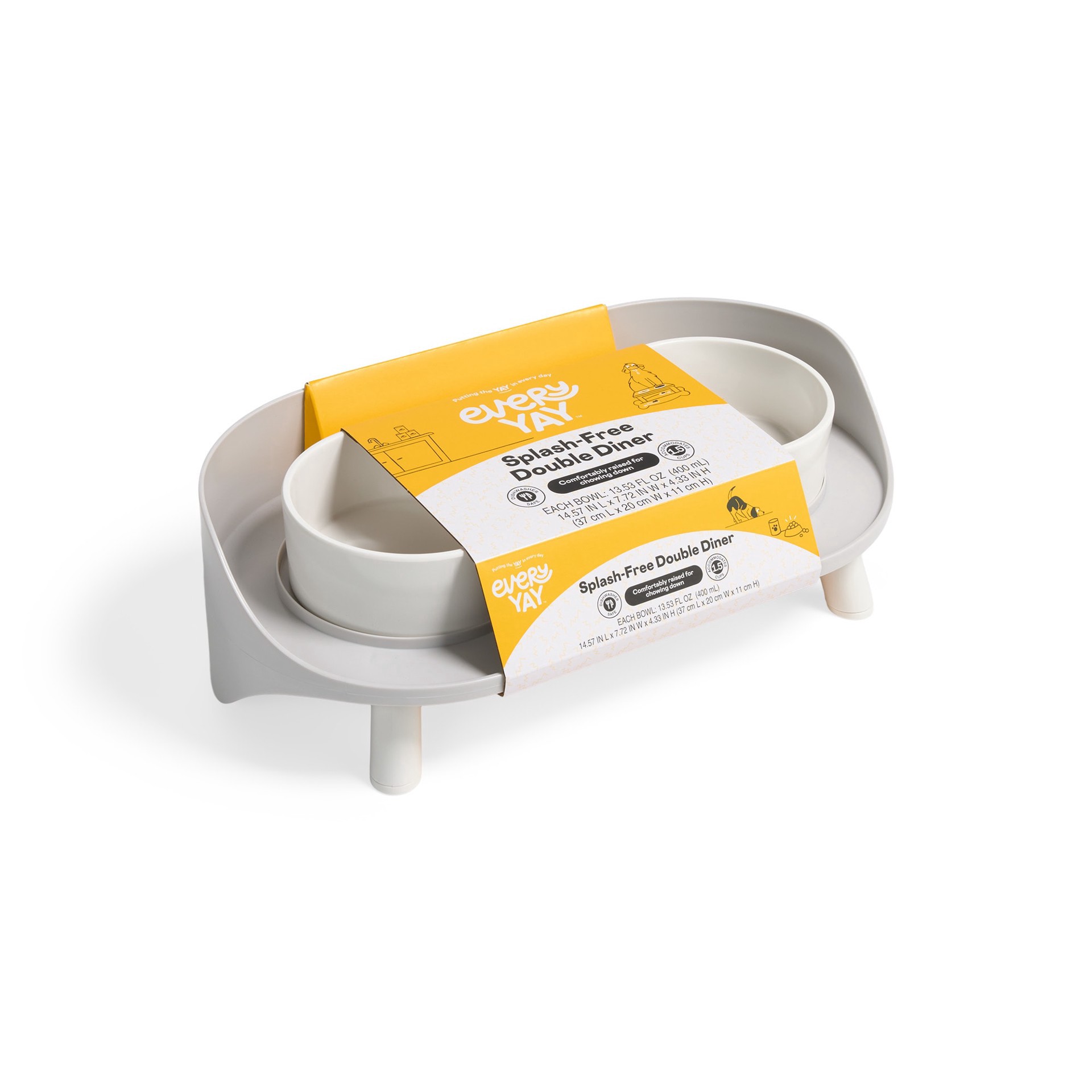 Make a stylish splash at mealtime while keeping water splashes at bay with the Splash-Free Elevated Double Diner for Dogs from EveryYay. This double diner has a raised back to protect walls from splas…