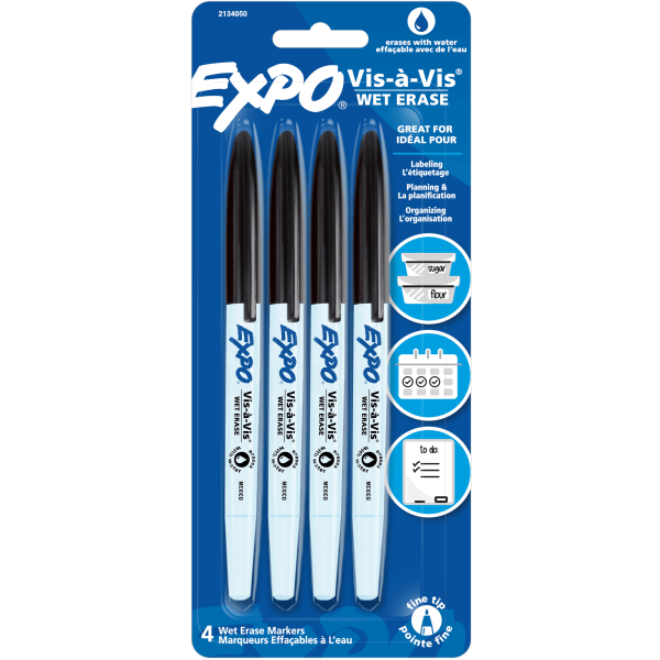 Label, plan, and organize with EXPO Vis-a-Vis Wet Erase Markers. Depend on these EXPO Markers for writing or drawing on whiteboards, hard plastic, laminated sheets, and other nonporous surfaces. The w…
