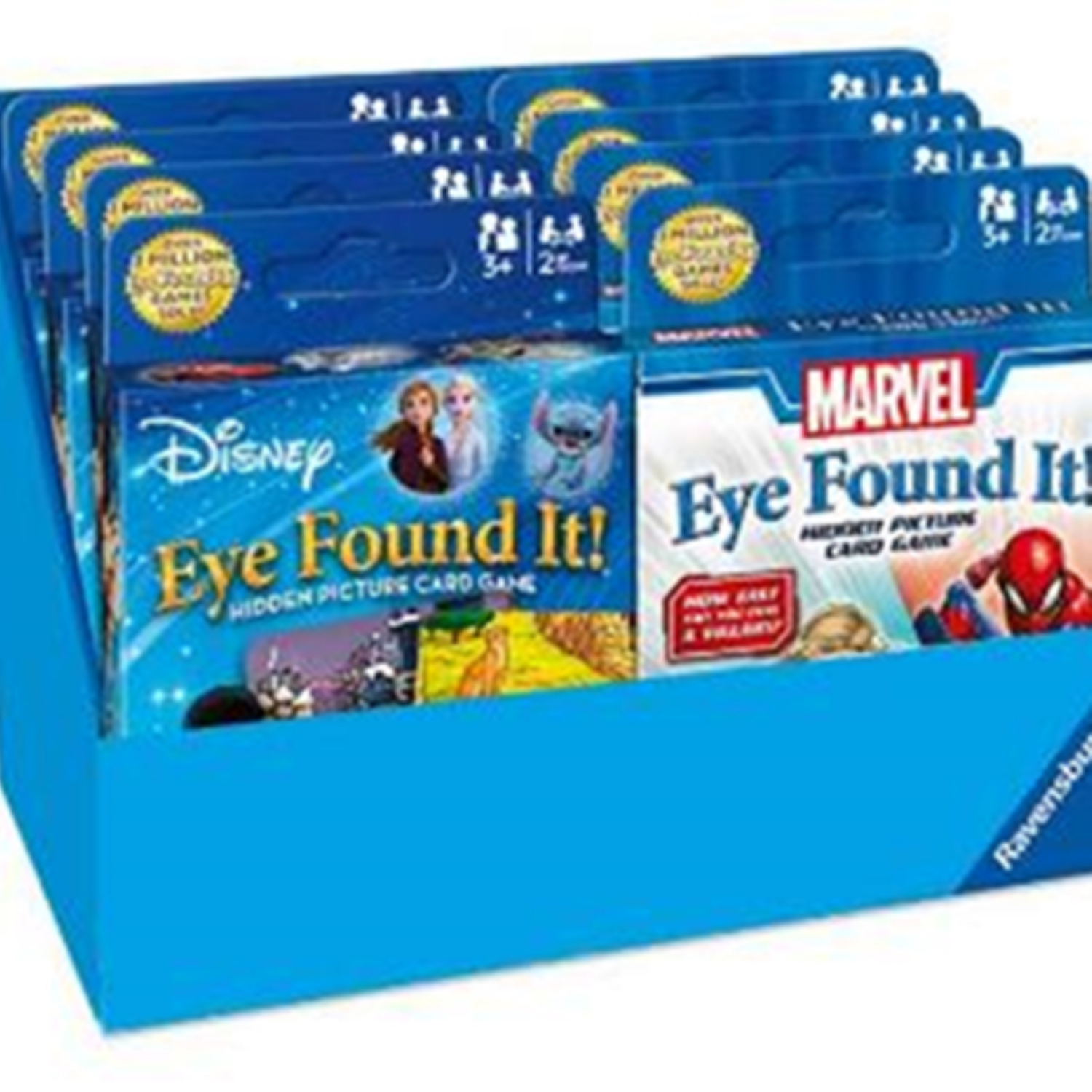 Eye Found It! On-The-Go Assortment. A hidden object is revealed in each turn. Players search the illustrated cards in their hand for that object. The first player to find one discards that card, and t…