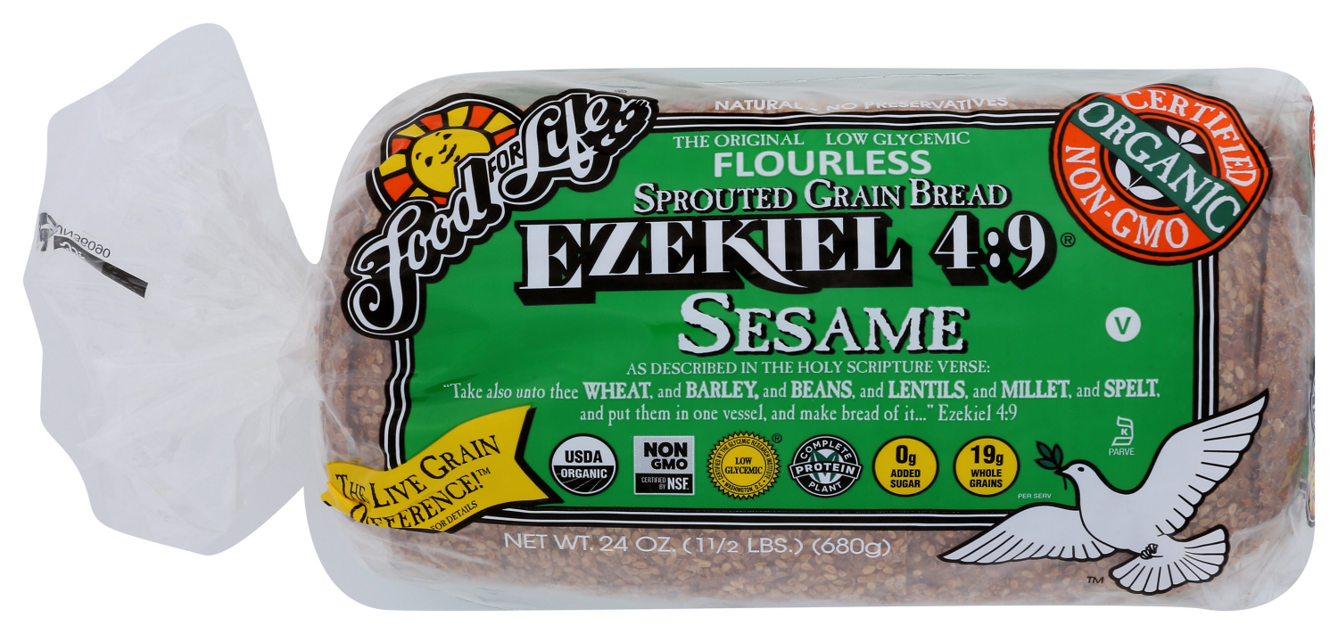 Original Ezekiel 4:9 Flourless Sprouted Grain Sesame Bread. Food for Life uses only the best natural and organic ingredients. Food For Life Baking Co.® makers of the incredibly delicious and nutritiou…