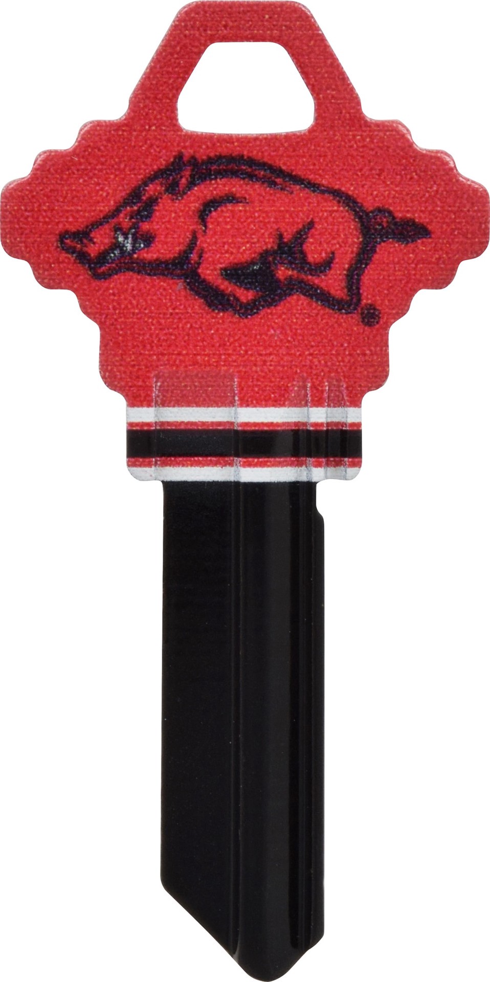 Decorative University of Arkansas Razorbacks team key. Can be cut to work as a functional house/office key. Works with most Schlage locks. Also available for Kwikset locks.