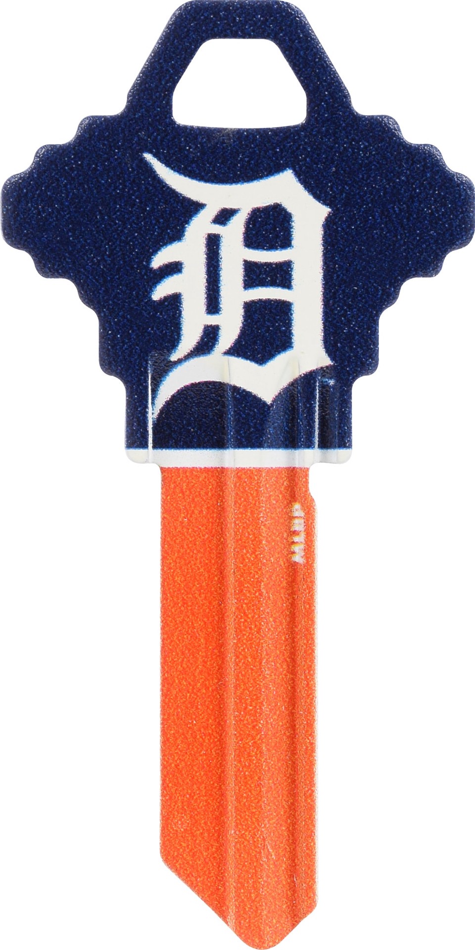 Painted team colors. Can be cut to work as a functional house/office key. Detroit Tigers. Works with most Schlage locks.