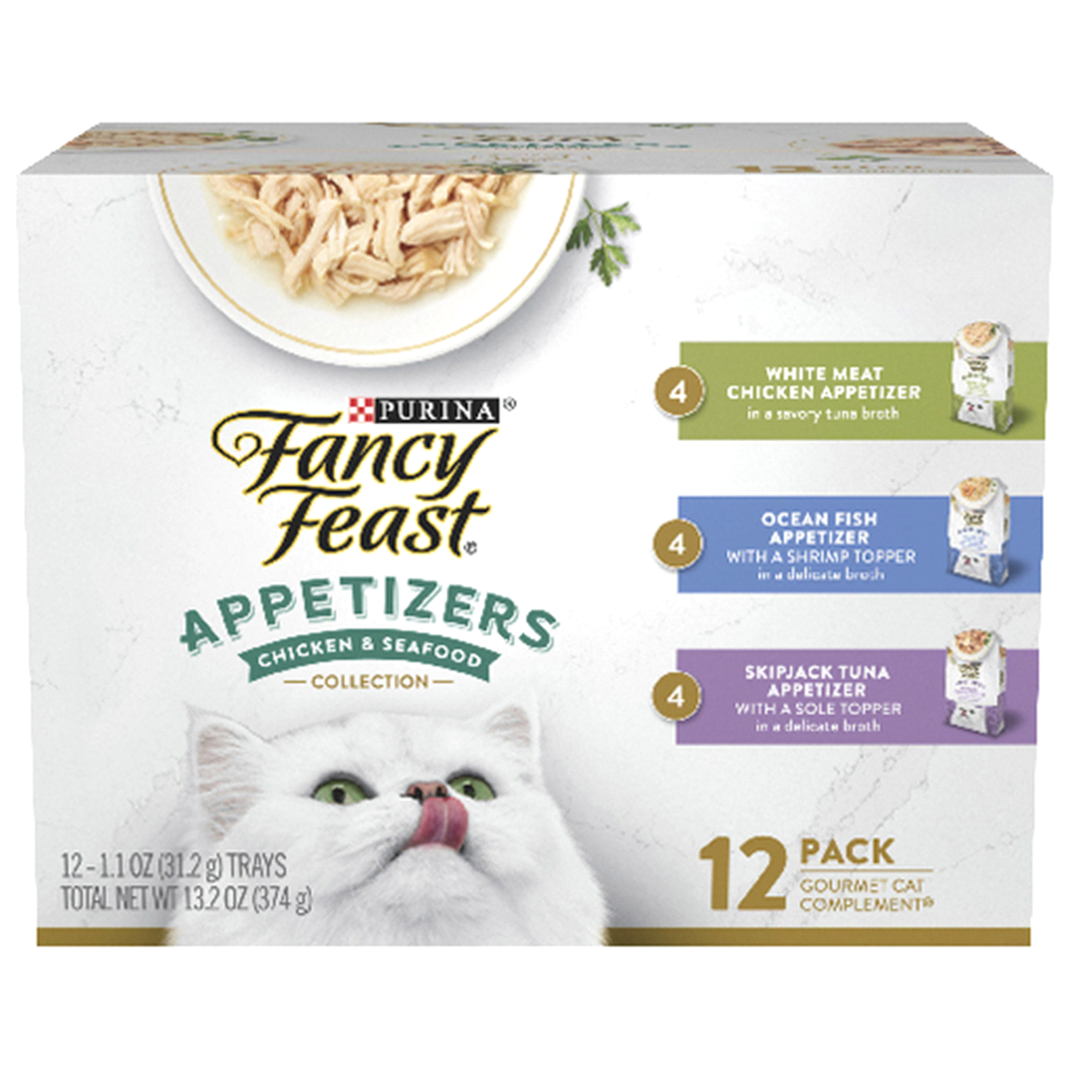 Please your cat's delicate palate with a Purina Fancy Feast Appetizers wet cat food grain free toppers variety pack. The handcrafted, tender mix-ins made with real chicken or fish in a delicate lickab…