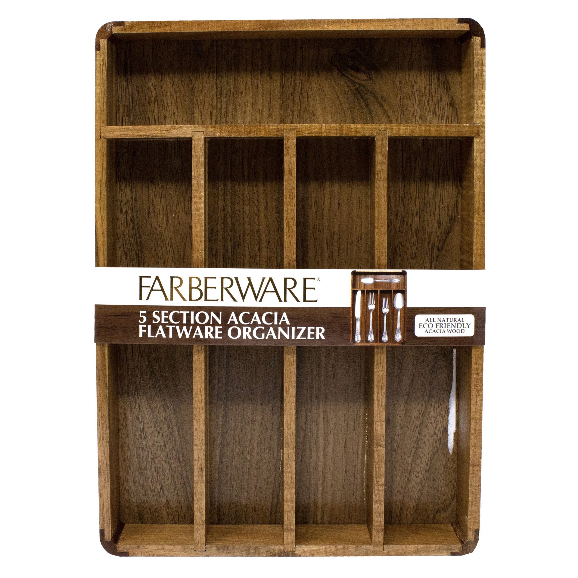 Keep your silverware organized with the help of this Farberware Acacia Flatware Tray. This tray features five compartments to snugly hold your cutlery. It is made of polished acacia for a sleek and so…
