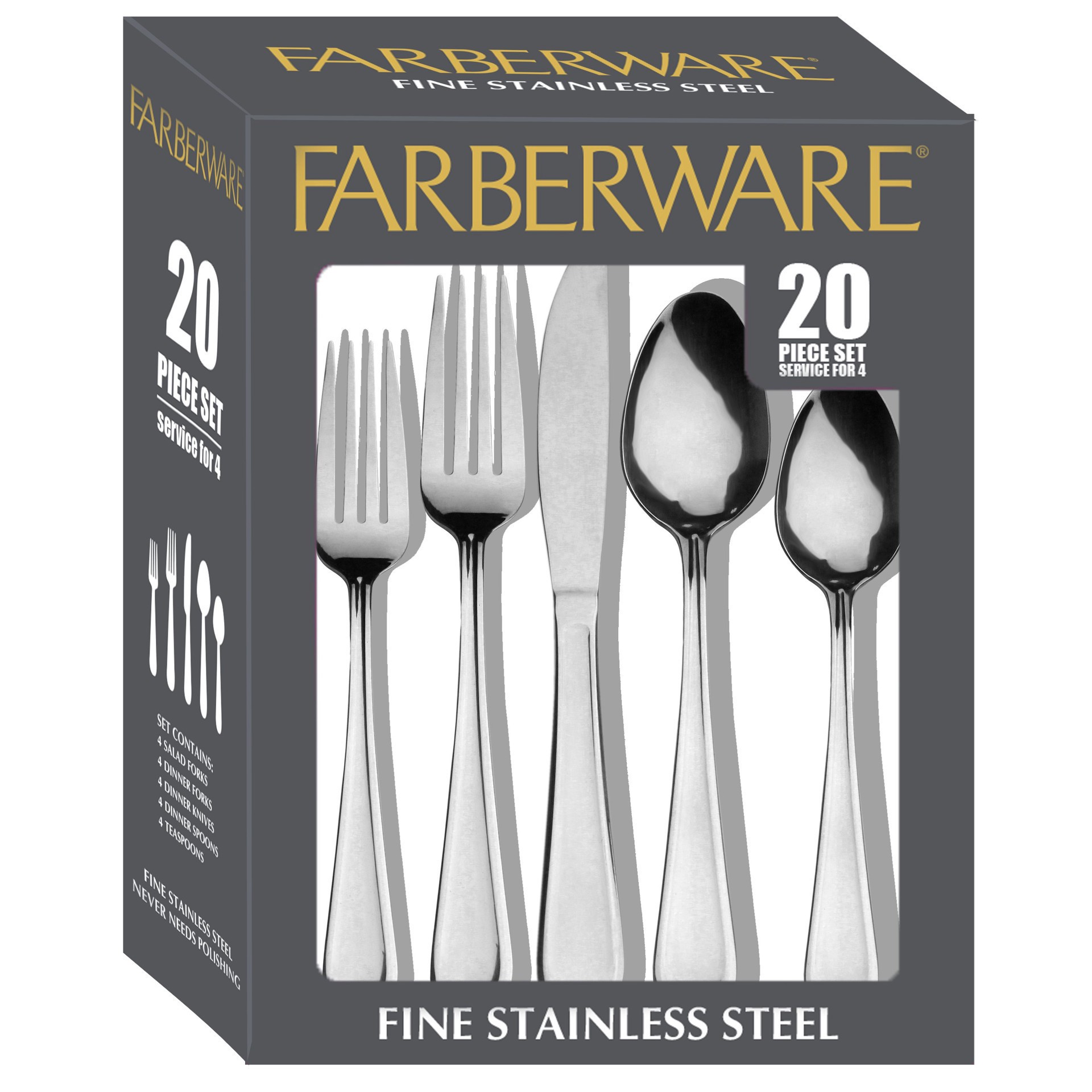 The Farberware 20-piece Centurion stainless steel flatware set features a brilliant mirror finish. The handles are framed with a subtle border and finished at the end of each handle with a decorative …