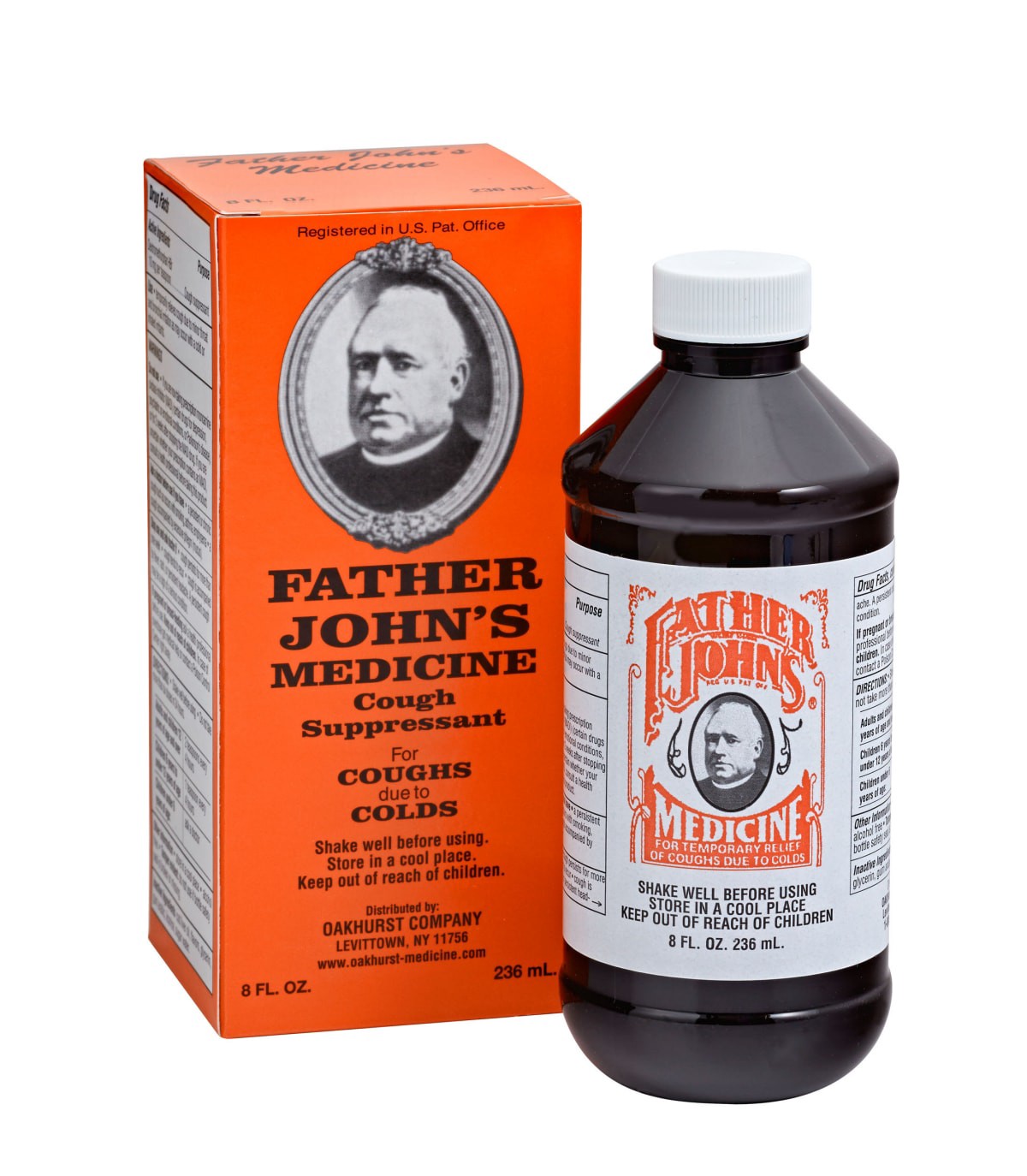 Father Johns Medicine relieves coughs due to colds and minor throat irritations. It is a wholesome family medicine. It consists of a cod liver oil base containing glycerin, sugar, licorice and flavoriā¦