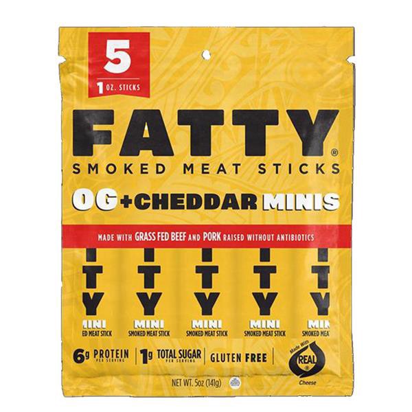 FATTY Original with Cheddar Minis Smoked Meat Sticks 5/1oz Bag. Hunger doesn’t stand a chance with the mini meat sticks. With 7g of high-quality protein, the FATTY Original with Cheddar is a 1g low-s…