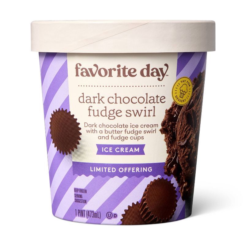Stock your freezer with a sweet treat ahead of your next gathering with this Dark Chocolate Fudge Swirl Ice Cream from Favorite Day™. This dark chocolate ice cream features a butter-fudge swirl and fu…