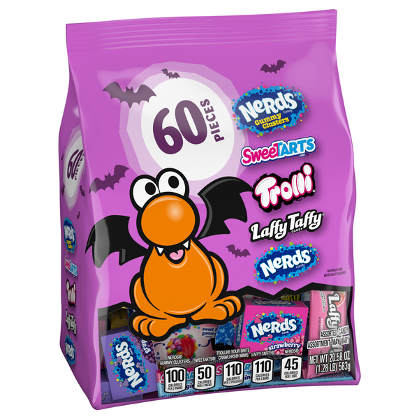 Get ready for Halloween with this ghoulish mix of ghostly goodies! Each bag contains 60 individual pieces of fan-favorite candies, including NERDS Gummy Clusters, SweeTARTS Originals, Trolli Sour Brit…