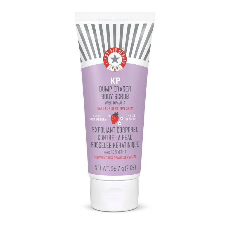 First Aid Beauty's KP Bump Eraser Body Scrub with 10% AHA, sweeps away dry, rough bumps associated with Keratosis Pilaris (KP) & strawberry skin, to reveal healthier, brighter looking skin. Now in a f…