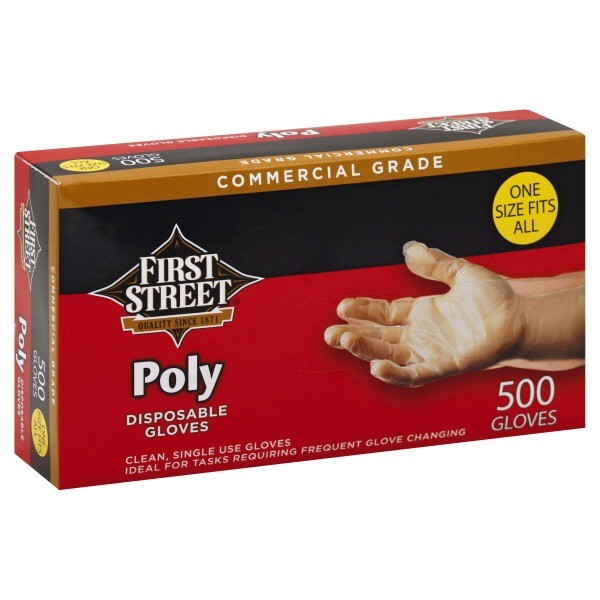 slide 1 of 1, First Street Disposable Poly Gloves, 500 ct