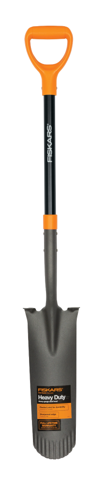 The heavy-duty Fiskars® Drain Spade features a heavy-gauge, steel head design with riveted connections that guarantee it won't detach from the handle, making it ideal for trenching, digging up bulbs, …