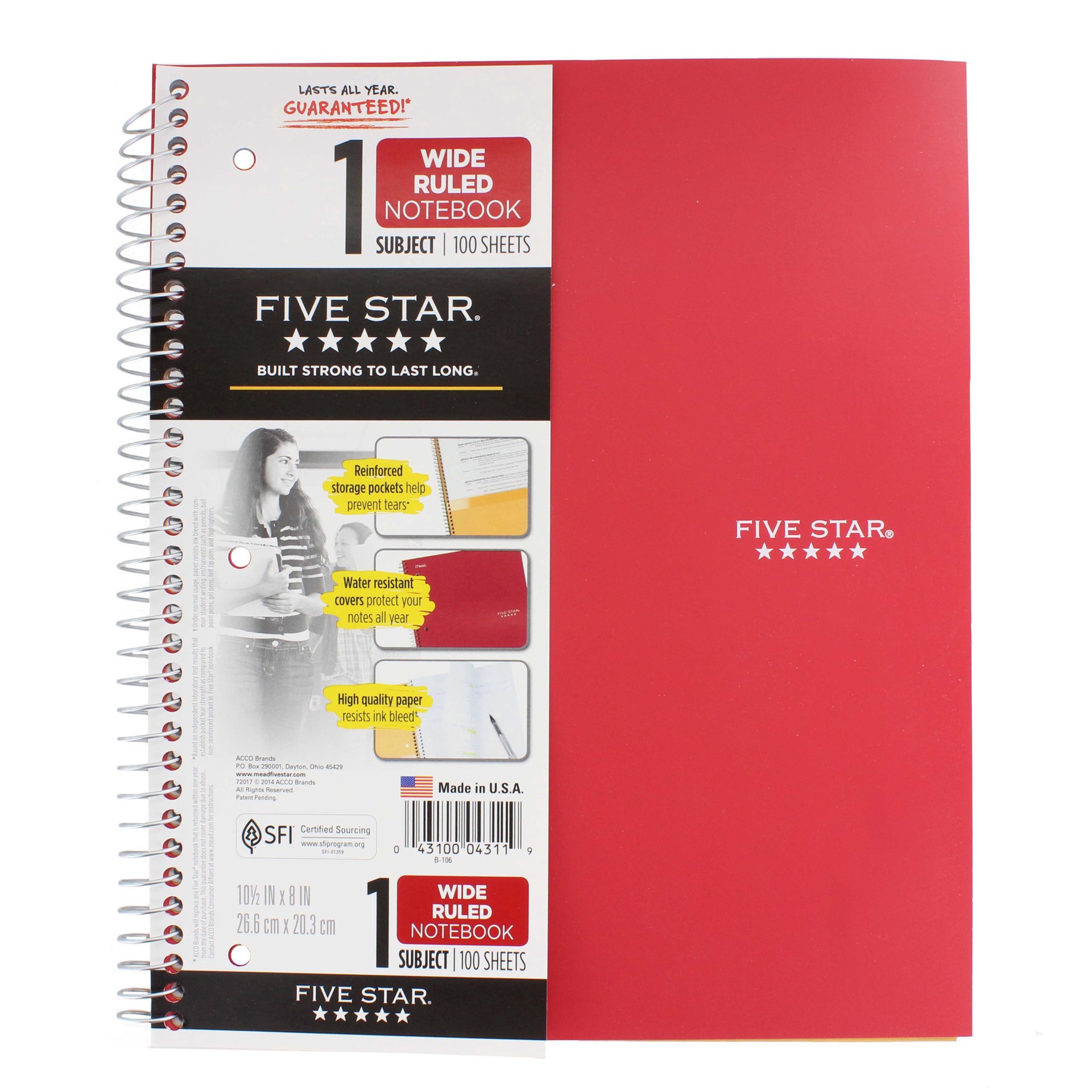 This Five Star Wide Ruled 1 Subject Notebook from Mead is top of its class. Containing 100 pages, this one subject wide ruled notebook features a wire binding to keep pages sturdily intact while insid…