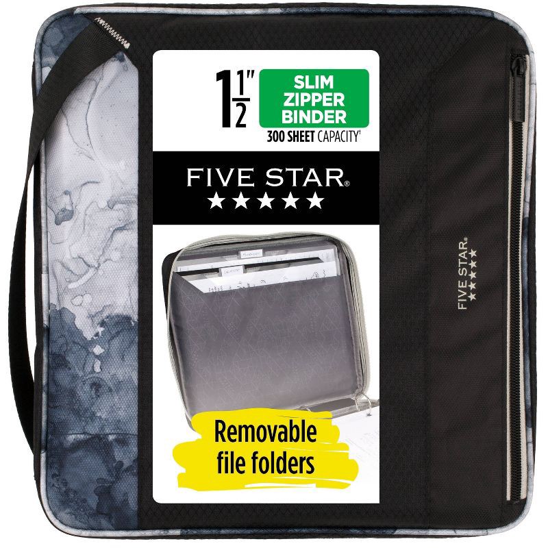 LASTS ALL YEAR. GUARANTEED!* Five Star® Slim Zipper Binder is conveniently sized to easily carry supplies to all your classes. The durable 1 1/2" binder holds up to 300 sheets** on 3 round rings. Orga…